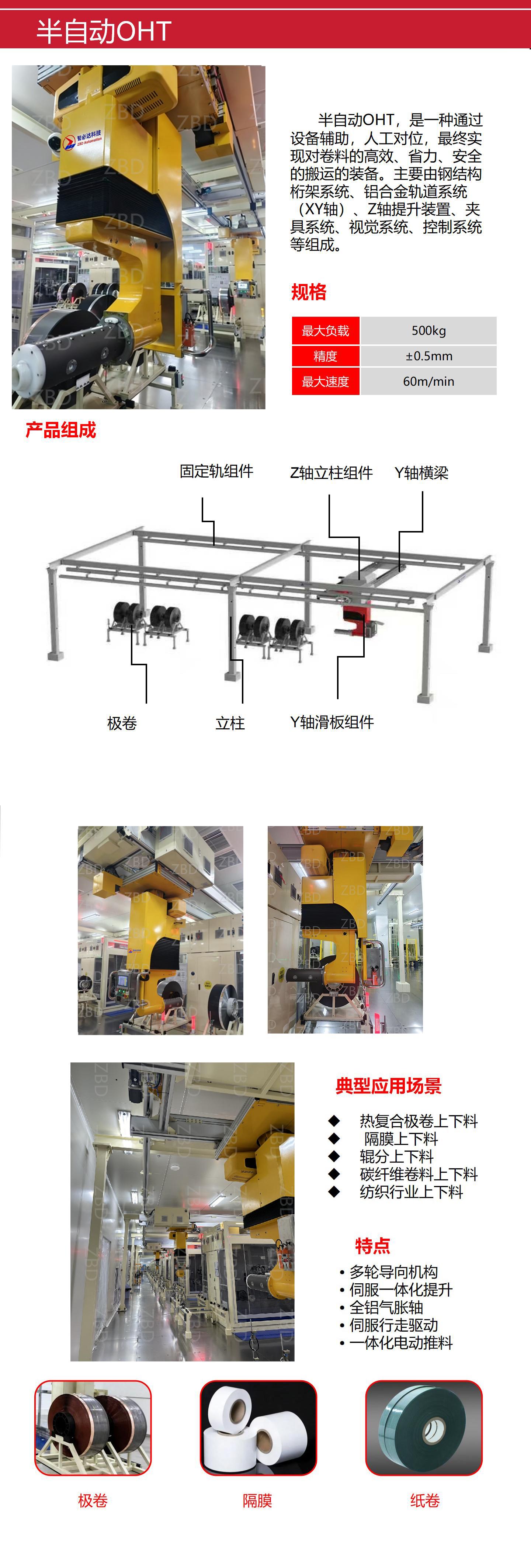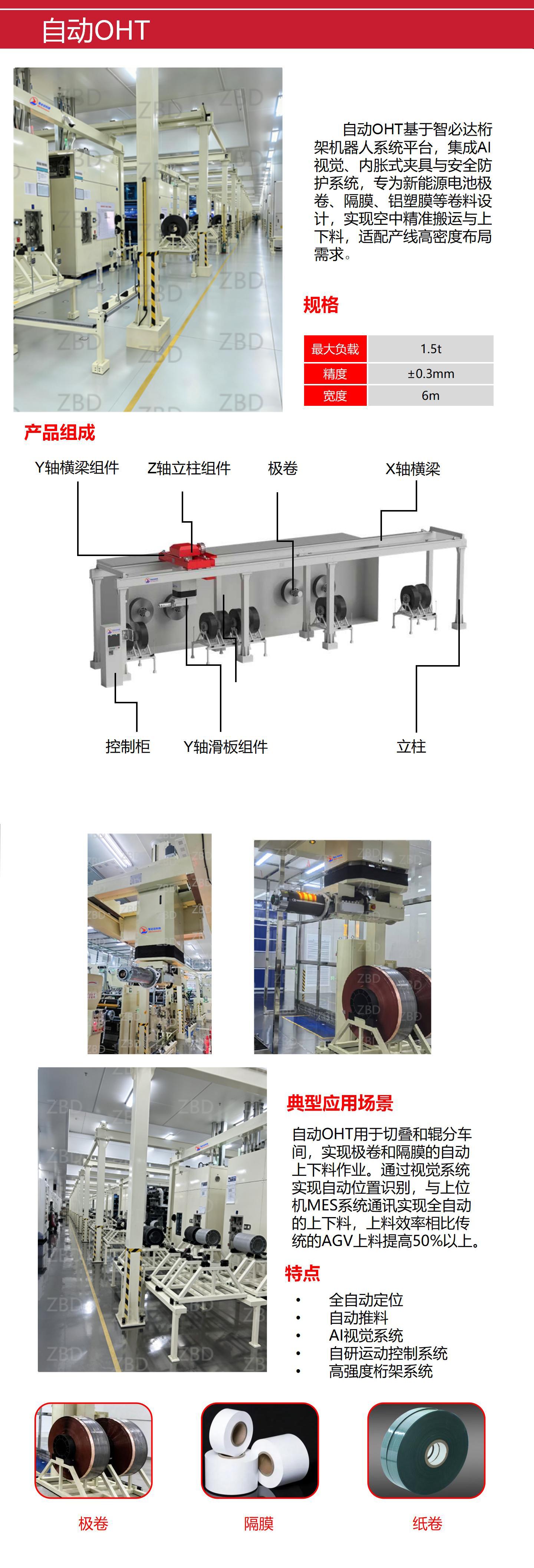 基于智必达桁架机器人系统平台,实现卷料的空中搬运与上下料。广泛应用于新能源电池极卷、隔膜、铝塑膜卷料等搬运场合。